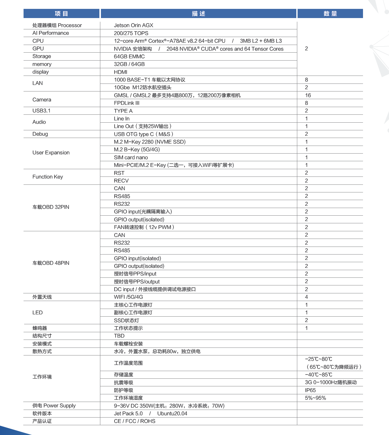 超高算力AMR自主行驶域控制器,,,,,是专为移念头械人等自主行驶车辆设计的一款域控制器,,,,,适用于智慧交通领域的环卫、配送、巡检、物流分拣、货运等应用场景。。。。。。搭载2个NVIDIA® Jetson AGX Orin?焦点模组,,,,,通过板端高速PCIE总线举行数据传输,,,,,整机可提供高达400/550 TOPS的边沿算力,,,,,2个盘算单位可自力/协同执行盘算使命,,,,,从而包管实时高效的处置惩罚性能,,,,,具备多传感器融合、感知、妄想、展望、决议等盘算能力。。。。。。