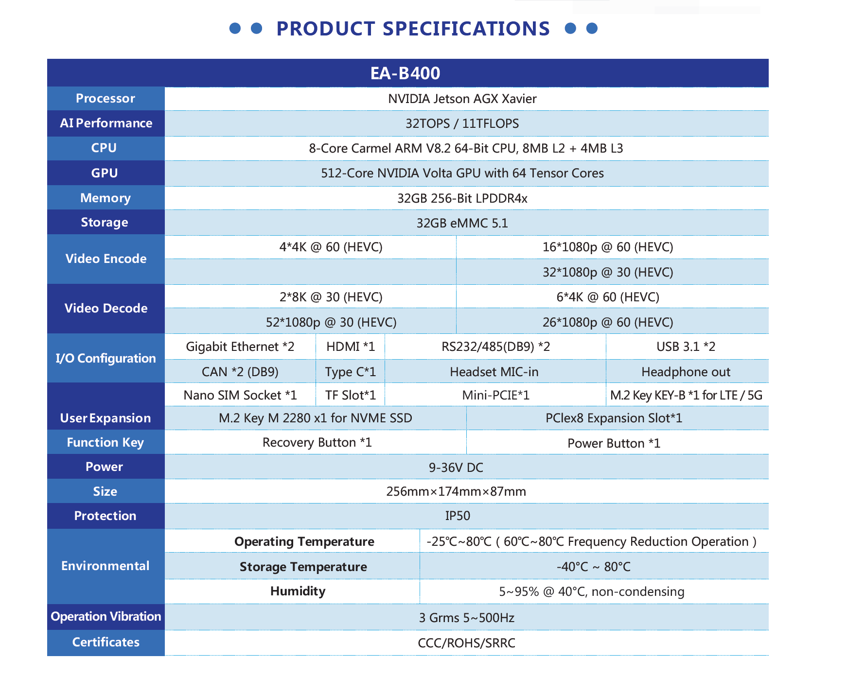 EA-B400 equipped with NVIDIA Jetson AGX Xavier core module. Contains 512 CUDA core Volta architecture GPU and NVDLA engine, module power consumption 30W provides real-time reasoning capability up to 32Tops, compatible with all current neural network models. The whole machine is fanless and strong embedded design, wide temperature working environment and high seismic protection level, and has strong adaptability to harsh industrial environments. At the same time, it integrates a variety of ex