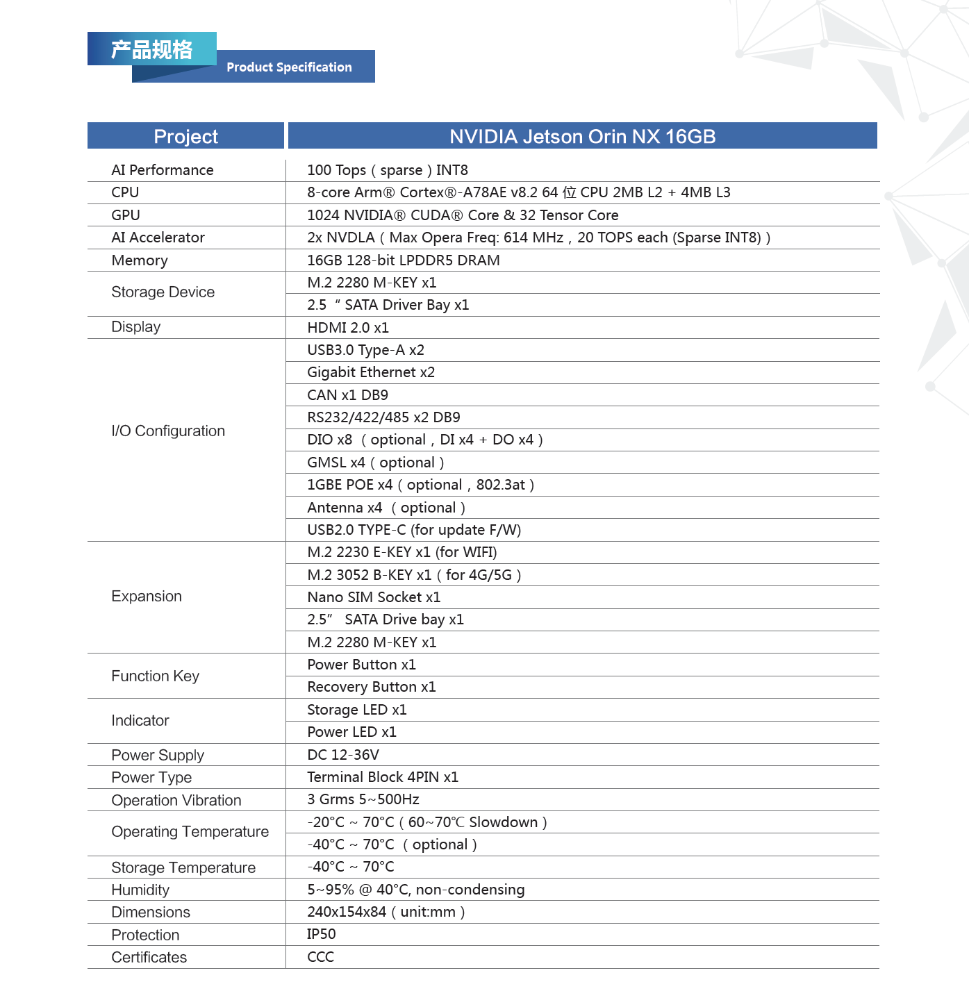 Powered by NVIDIA Jetson Orin NX core module, combined with 8-core ARM v8.2 64-bit CPU and NVIDIA Ampere architecture GPU, it contains 1024 CUDA cores and 2 NVIDIA DLA, providing up to 100 Tops real-time inference capability. It is compatible with all current neural network models. The whole machine adopts fan less strong embedded design, supports wide temperature working environment, and has strong adaptability to harsh industrial environment. With a wealth of peripheral interfaces, and reserve a variety of wireless module expansion interface, support 4G/5G/WIFI multiple communication methods. It can be widely used in multiple application scenarios of intelligent transportation, intelligent security, intelligent medical treatment, intelligent retail and other industries.
